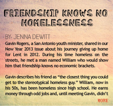 “Gavin Rogers, a San Antonio youth minister, shared in our New Year 2013 issue about his journey giving up home for Lent in 2012. During his time homeless on the streets, he met a man named William who would show him that friendship doesn’t recognize economic brackets.”