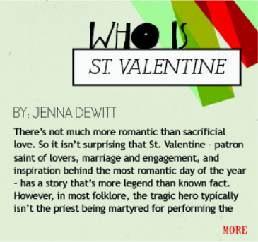 “There’s not much more romantic than sacrificial love. So it isn’t surprising that St. Valentine – patron saint of lovers, marriage and engagement, and inspiration behind the most romantic day of the year – has a story that’s more legend than known fact.”